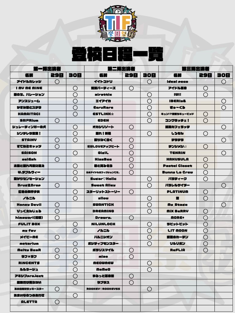 アイドルカレッジ / I MY ME MINE / 雨のち、ハレーション / アンスリューム / かすみ草とステラ / KAMAITACI / SAI²Rium / シュレーディンガーの犬 / シンデレラ宣言! / STAiNY / すてねこキャッツ / SAISON / selfish / 太陽と踊れ月夜に唄え / W.ダブルヴィ一 / 強がりセンセーション / Drug&Drop / 虹色の飛行少女 / ノルニル / Honey Devil / びっくえんじぇる / himawari(船橋) / FULIT BOX / my fav / メイビーME / metarium / Melty BeaR / ラフ×ラフ / RiNCENT♯ / ルルネージュ